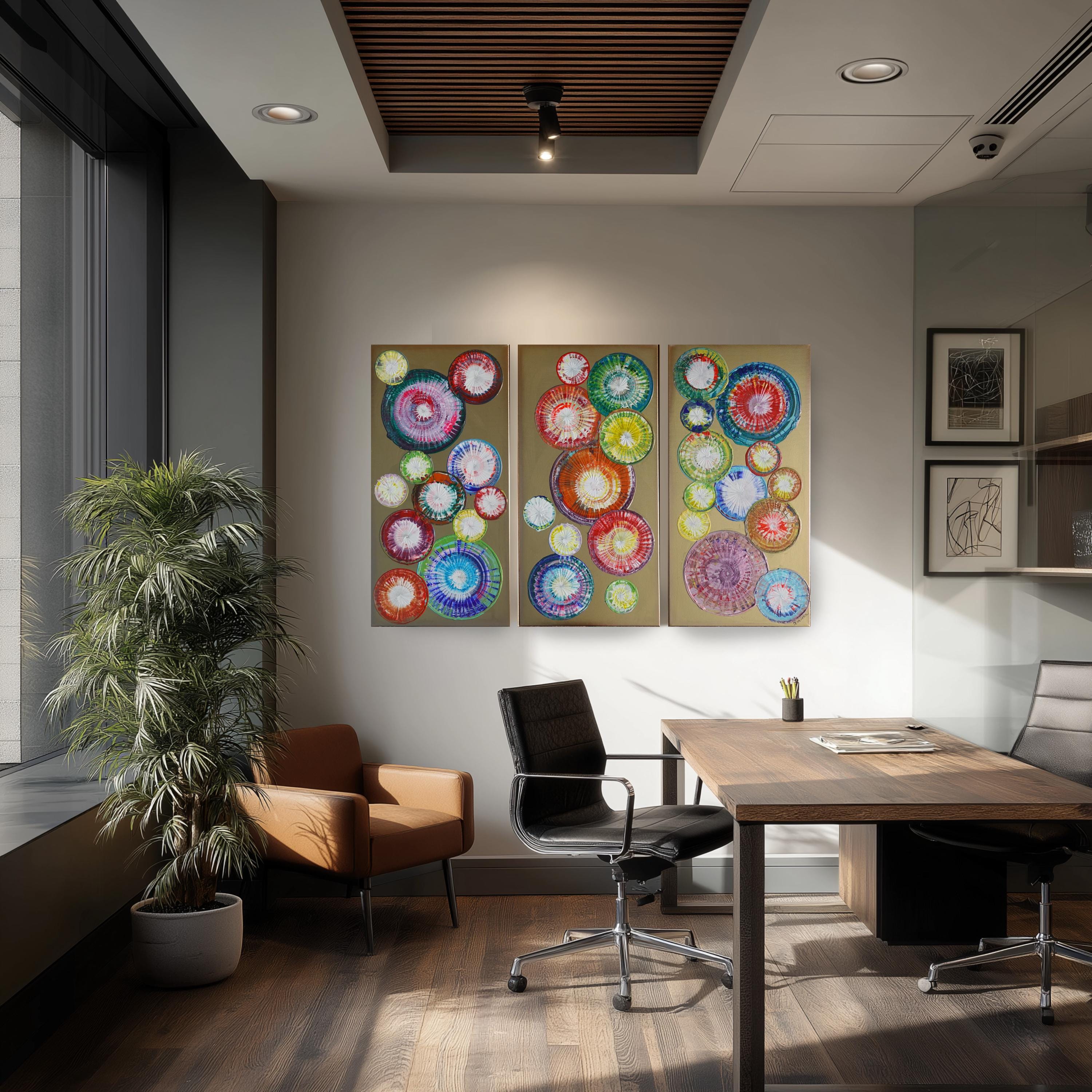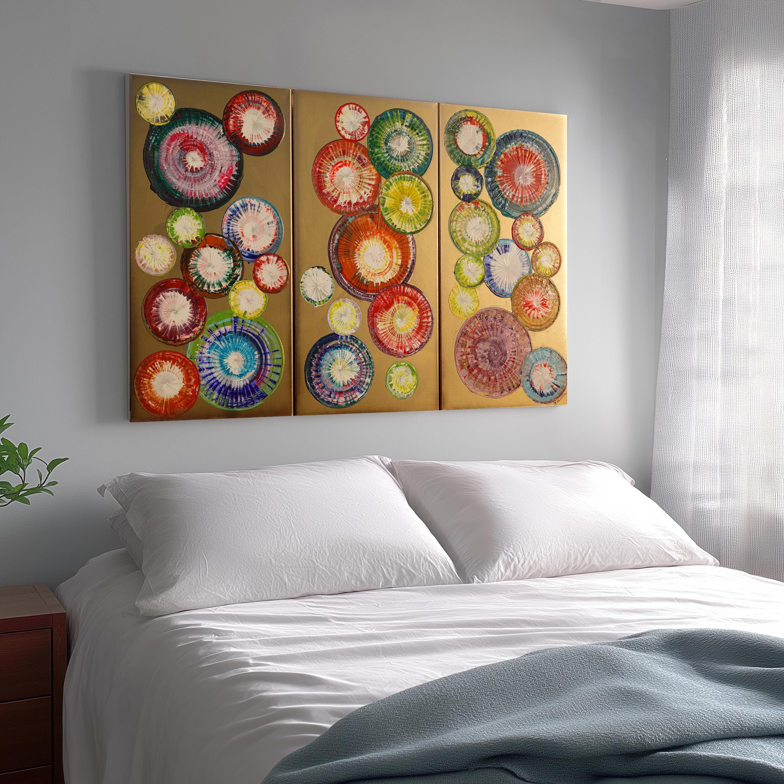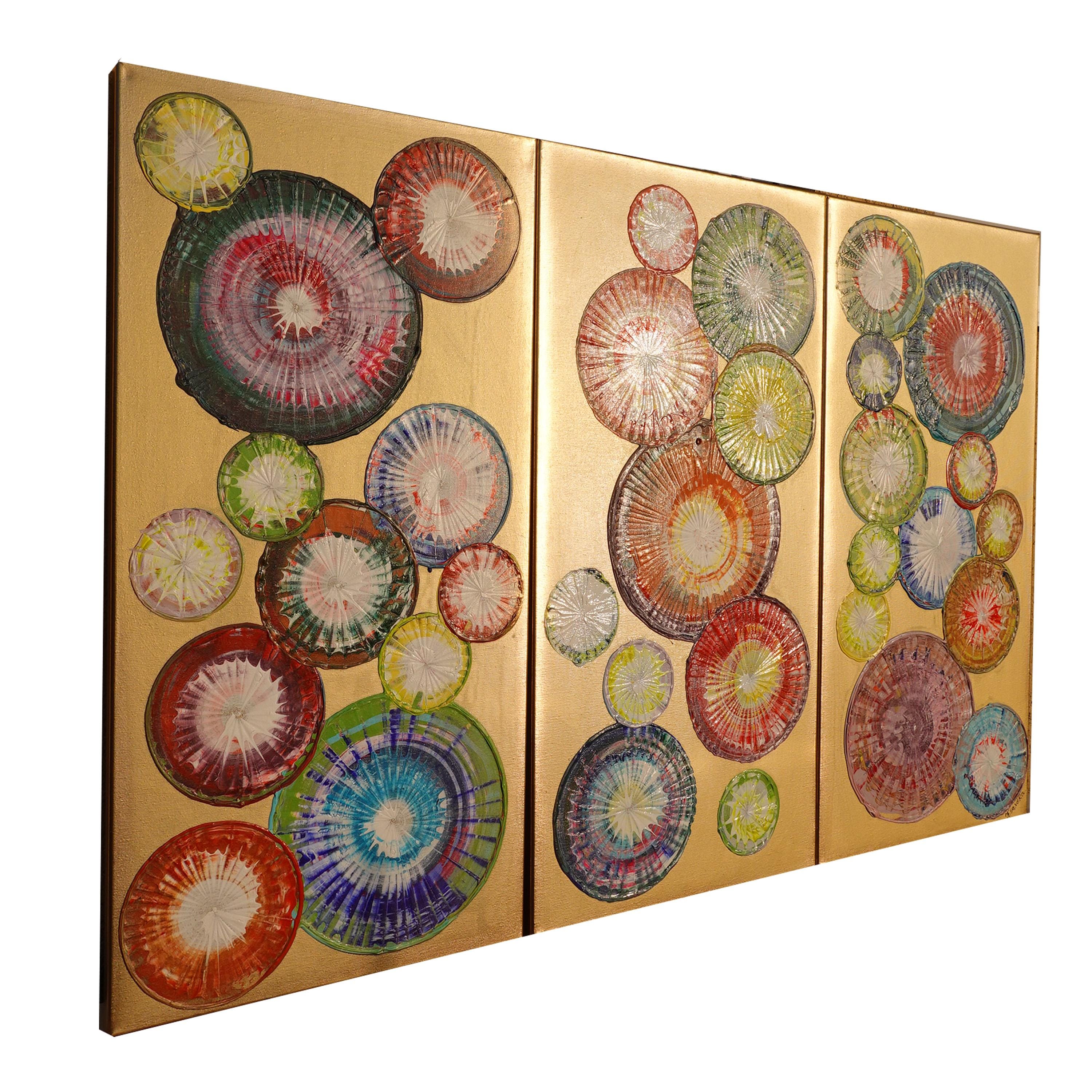 This gold triptych painted with top-quality acrylics on stretched canvas, it's an eye-catching piece for walls, with changing metallic effects depending on the lighting.