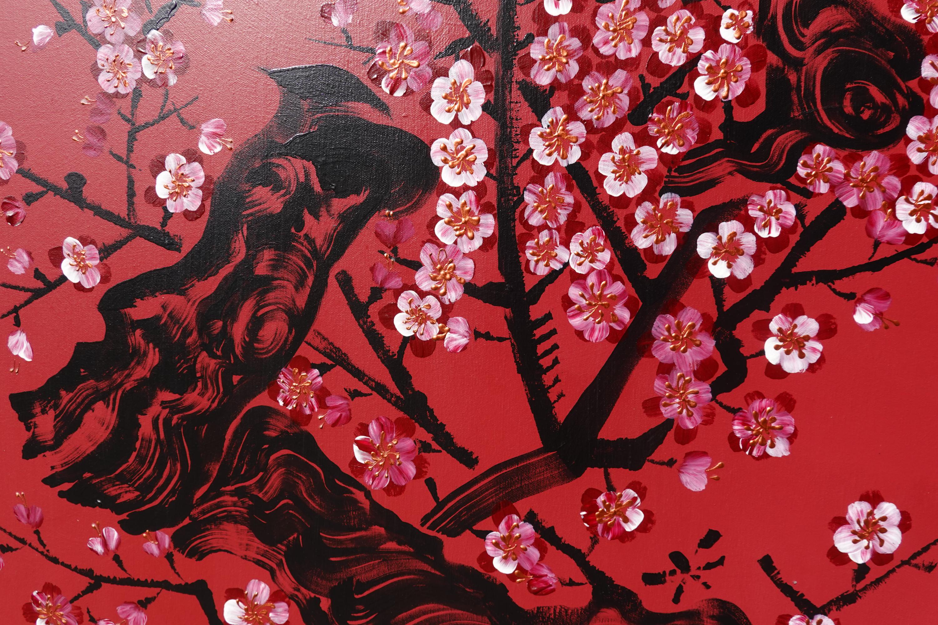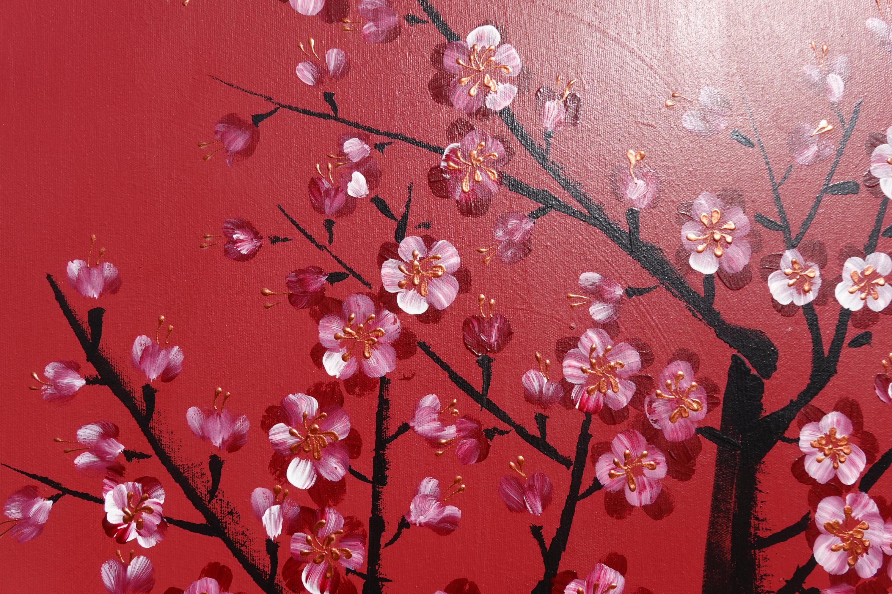 Bronze Japanese Painting J422 | Modern floral Wall Art | Red and Gold Original Canvas | Contemporary Home Decor