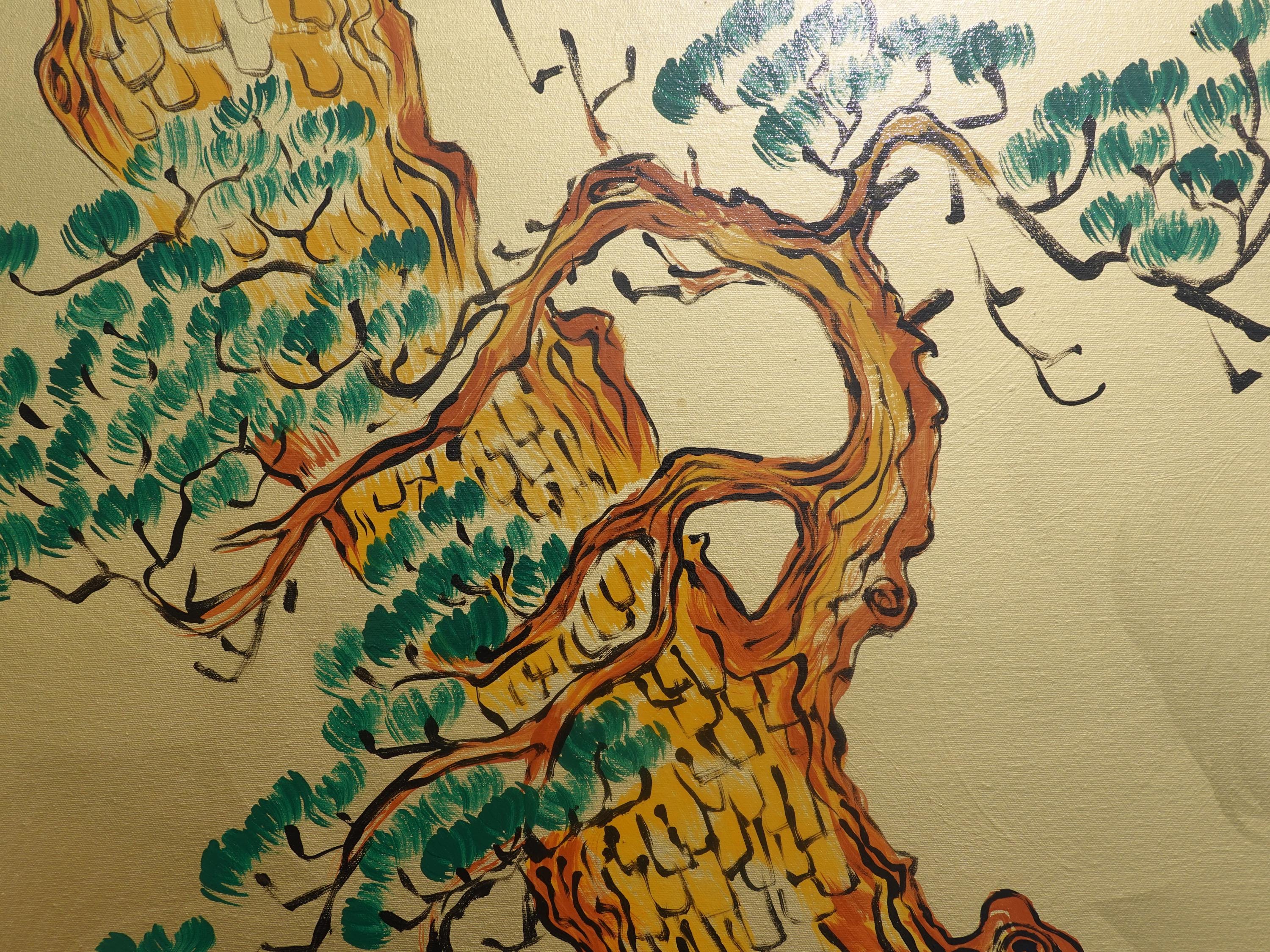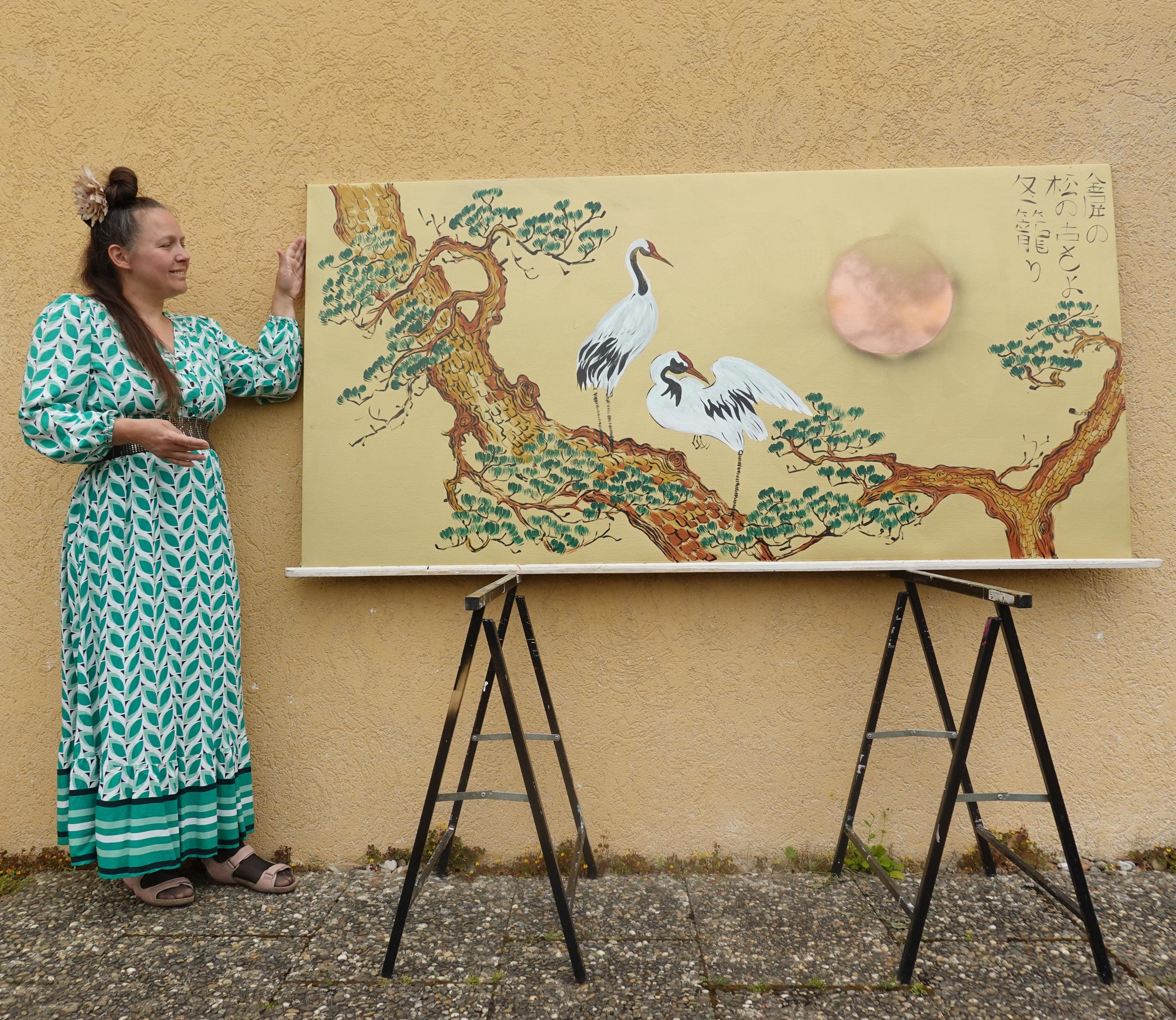 Japanese crane J376 by artist Ksavera - gold extra large original acrylic painting on unstretched canvas 100x210cm