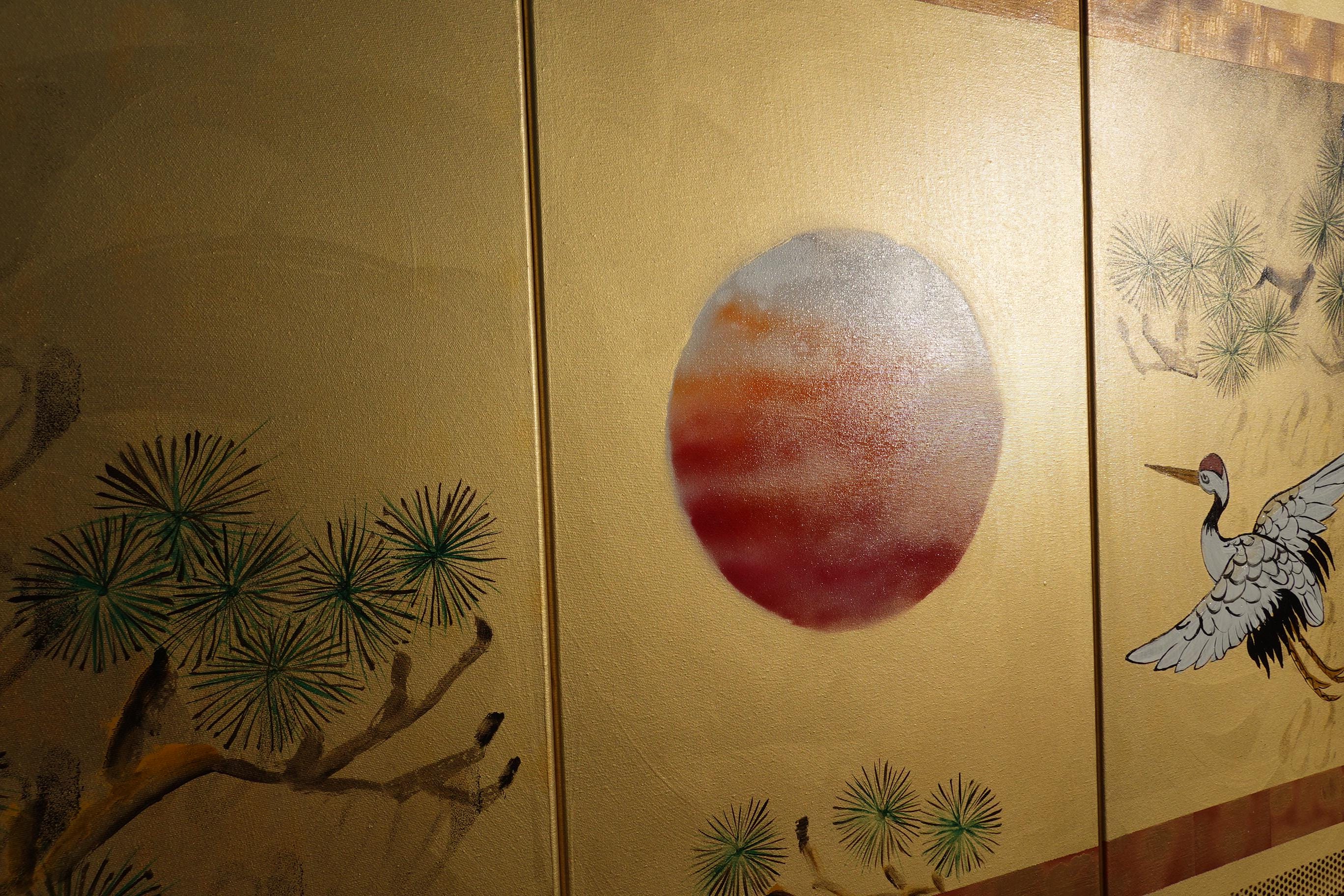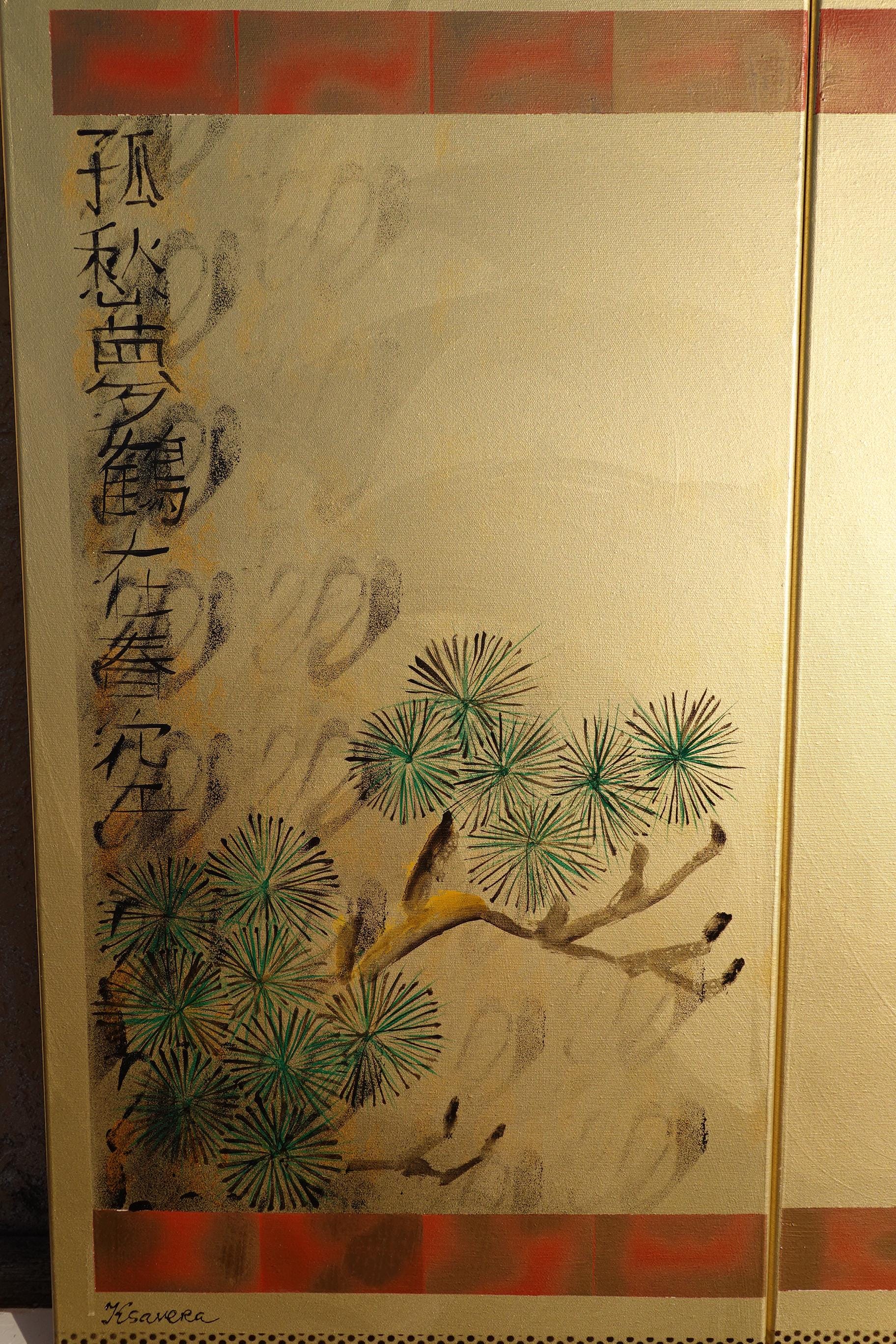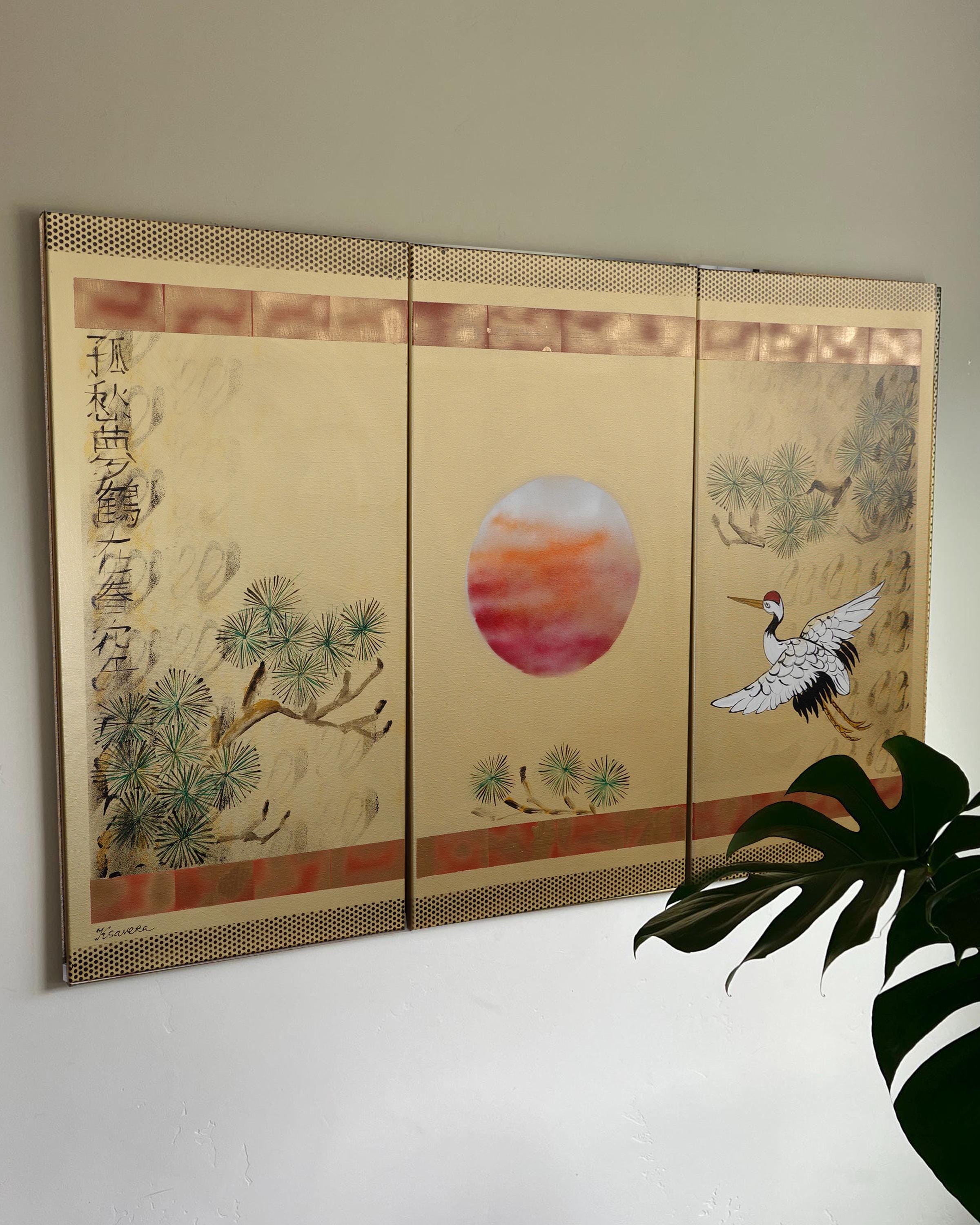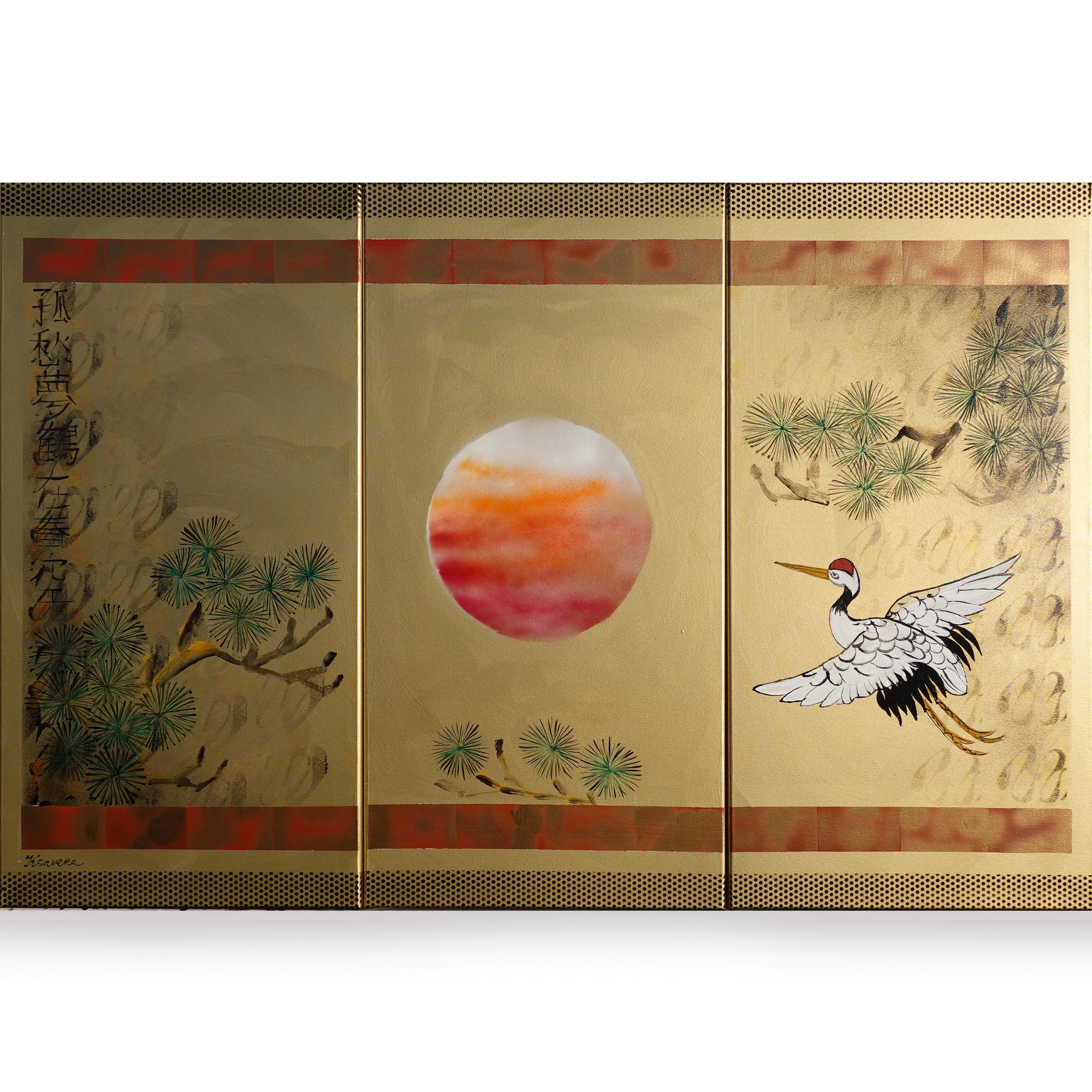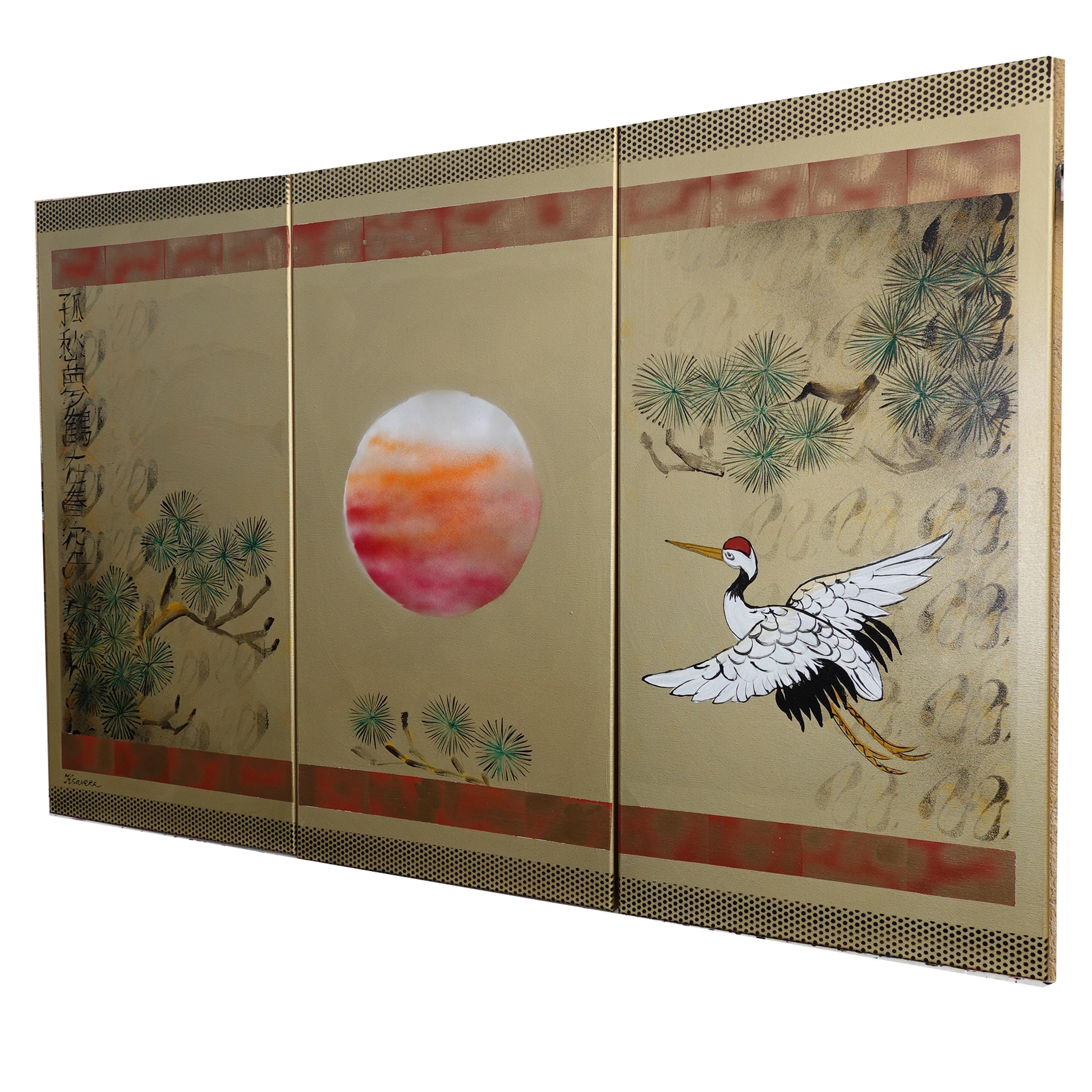 Japanese style painting - Crane J413 - Gold paintings - Japan art - acrylic paintings on stretched canvas - triptych art by artist Ksavera